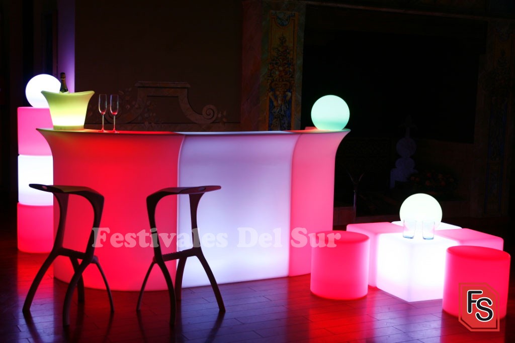 Festivales del Sur, pone esta temporada a disposición de todos sus clientes mobiliario de Leds, barras modulares, esferas, cubos, cilindros, mesas altas, cubiteras, añadirán a sus eventos un toque de luz y color desconocido hasta ahora.